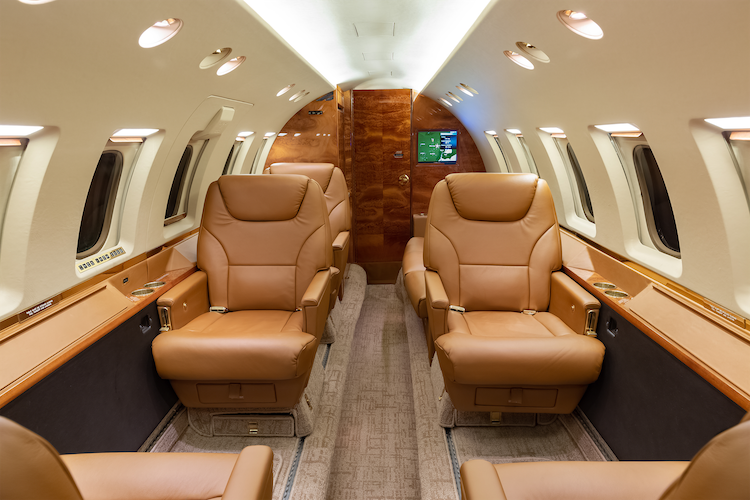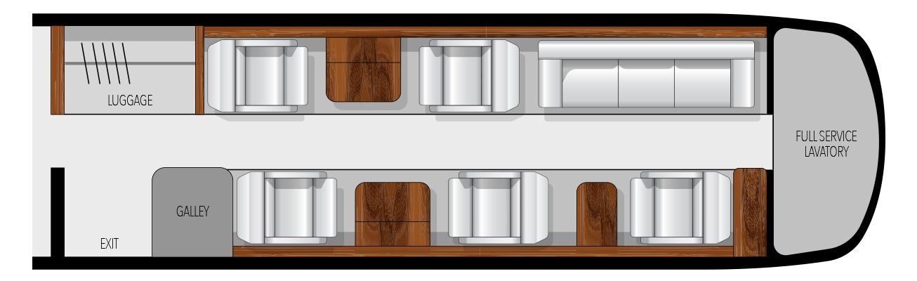 The cabin of the Hawker 800XP is typically configured with eight seats: a four-person club section, a three-person divan, and one forward-facing seat. The seats are fully adjustable and can swivel 360°. Soundproofing has been optimized to keep cabin noise levels in the low 70-decibel range. The cabin itself measures 21.3 feet long, 5.7 feet high and 6 feet wide. There is a baggage compartment accessible in-flight which holds 48 cubic feet of luggage.